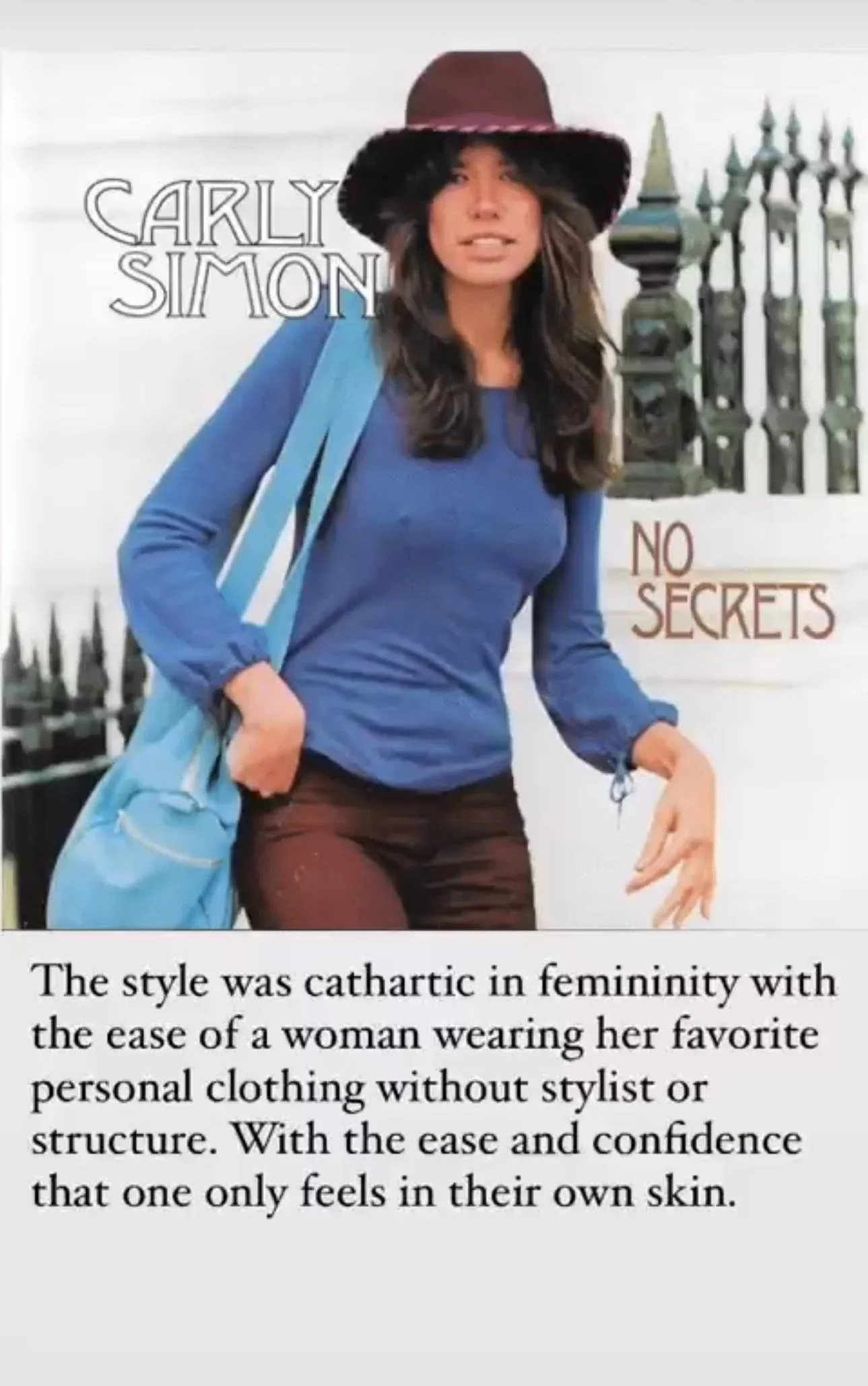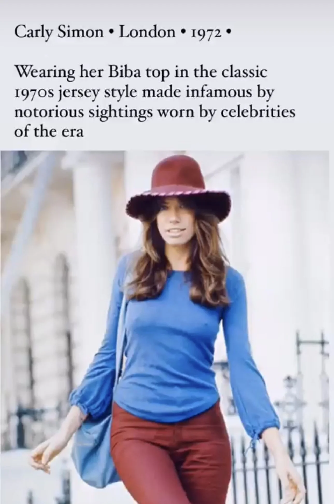 • Carly Simon is wearing a blue Biba jersey top; designed by Barbara Hulanicki