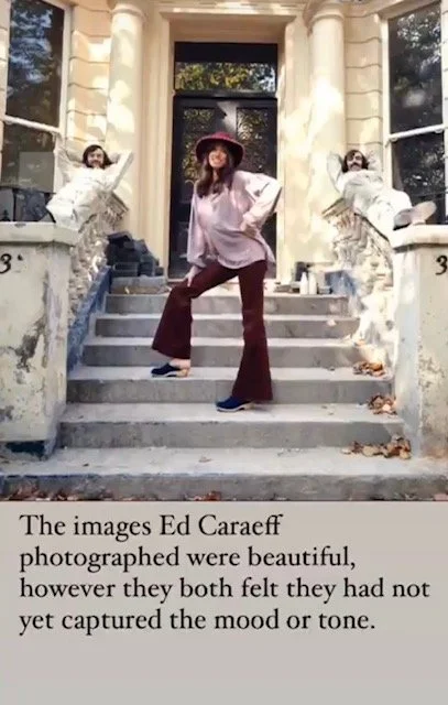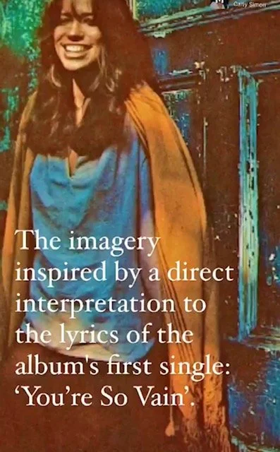 They had a full day experimenting with various settings and changes of clothing, including a hat strategically dipped below one eye and a scarf that was apricot. The imagery inspired by a direct interpretation to the lyrics of the album's first single ‘You’re So Vain’. They abandoned the vision entirely on the afternoon stroll back to the studio.