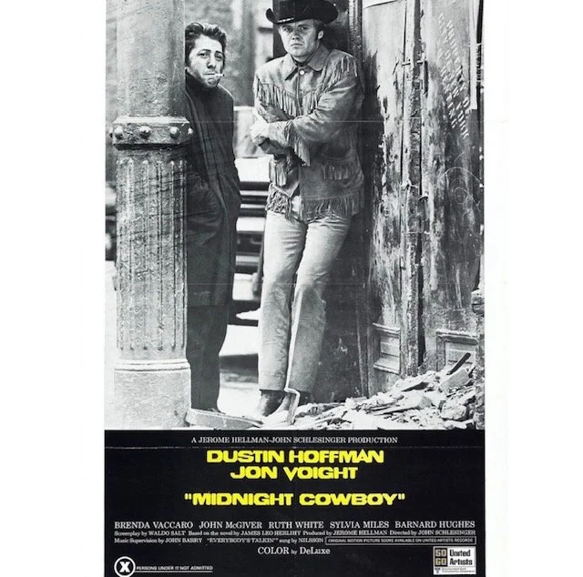 Dustin Hoffman and Jon Voight in 1969 for ‘Midnight Cowboy’ set in the broken dreams of late 1960s New York City with survival of a harsh winter in salvation of an abandoned building and undying skills only a street education can teach.