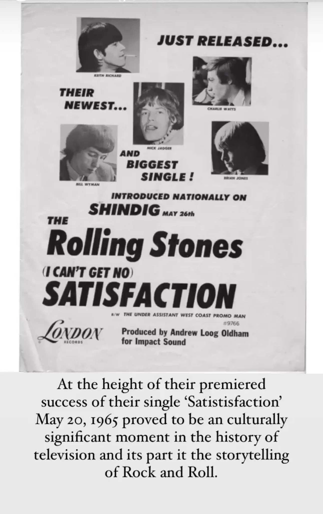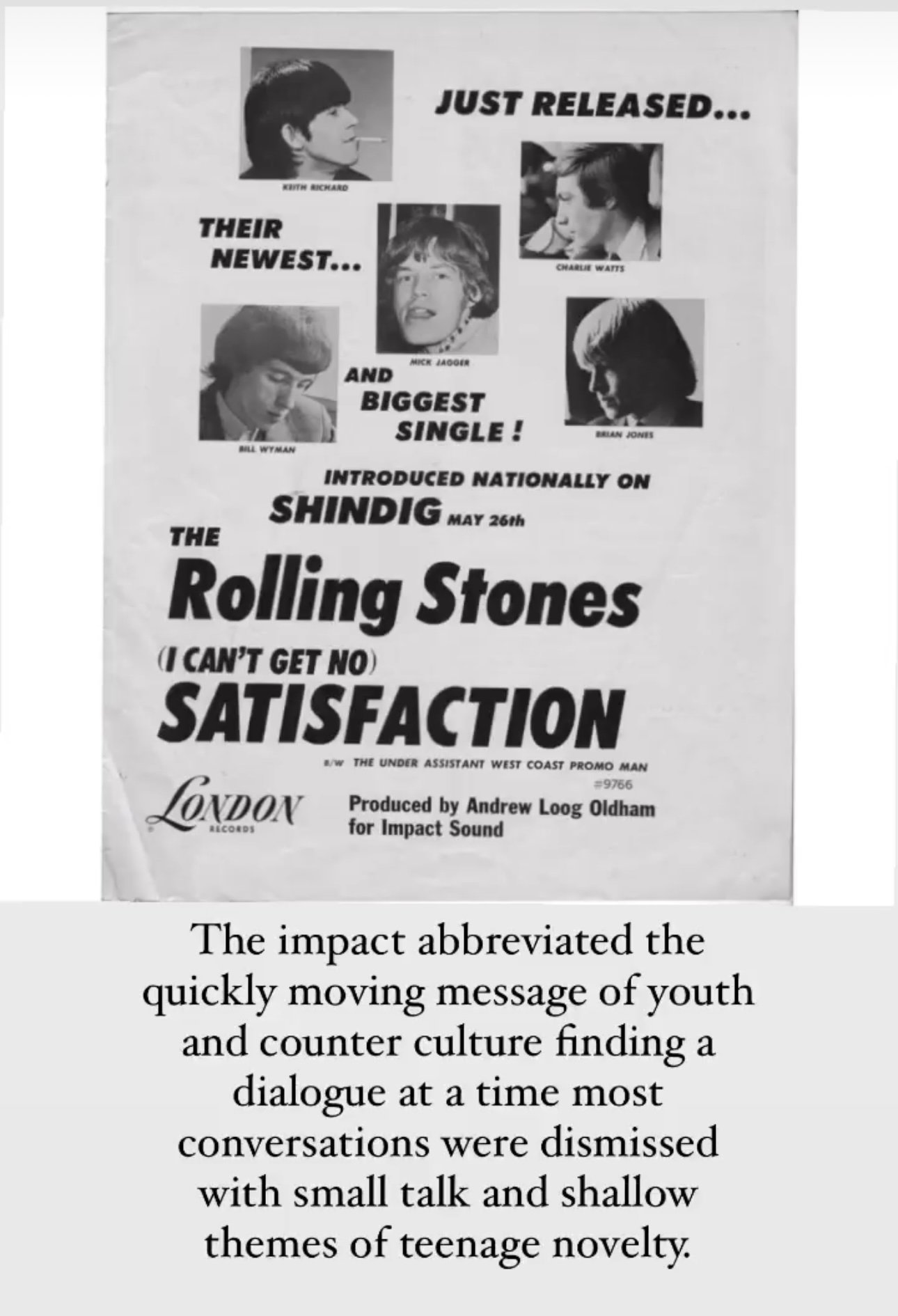At the height of their premiered success of their single ‘Satistisfaction’ May 20, 1965 proved to be an culturally significant moment in the history of television and its part it the storytelling of Rock and Roll. The impact abbreviated on the quickly moving message of youth and counter culture finding a dialogue at a time most conversations were dismissed with small talk and shallow themes of teenage novelty.